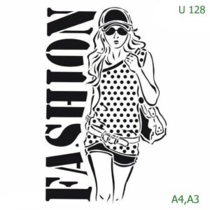 Plastová šablona pro malování – Cizí nápisy – Módní silueta s nápisem Fashion (U128)