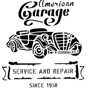 Plastová šablona pro malování – Cizí nápisy – Retro logo American Garage s autem (U016)