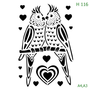 Plastová šablona pro malování – Zvířata, ptáci, motýli a ryby – Dva papoušci se srdíčky (H116)