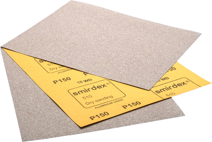 Arch latexového papíru 230 × 280 mm, zrno aluminium oxide, pojivo pryskyřice, rozptyl zrna polootevřený, stearatová vrstva proti zanášení.