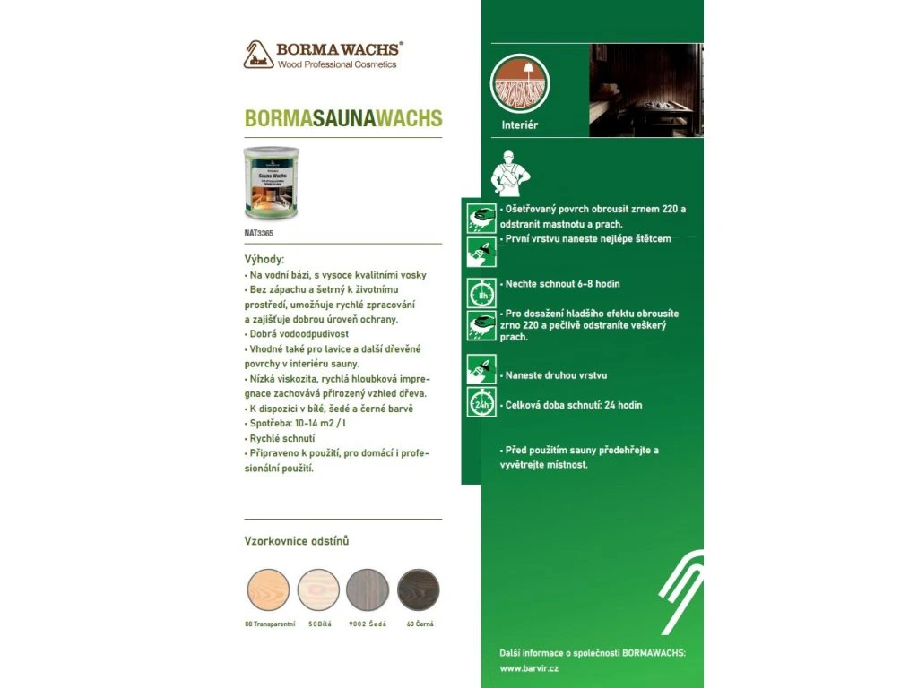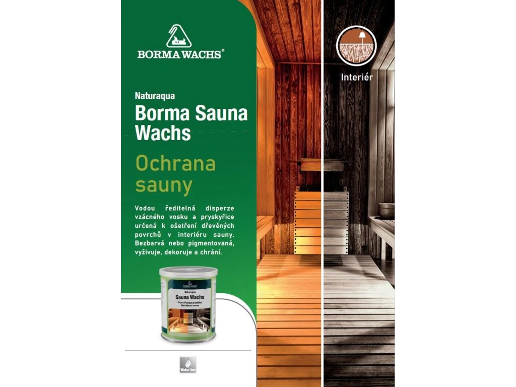 Vosková povrchová úprava dřeva na bázi vody, formulovaná pomocí kvalitních vosků a pryskyřic, která je určena speciálně pro všechny vnitřní povrchy saun (lavice, obložení, podlahy, podhledy) a jakýkoliv jiný dřevěný povrch v interiéru. Nemění odstín dřeva, dává mu příjemný přírodní efekt a chrání před zašpiněním a vodou. Je k dispozici v odstínech s bílým , šedým a černým nádechem nebo jako transparentní. Díky své nízké viskozitě a prodyšnosti vodním parám je výrobek absorbován hluboko do dřeva a povrch zůstává přírodní a hebký.