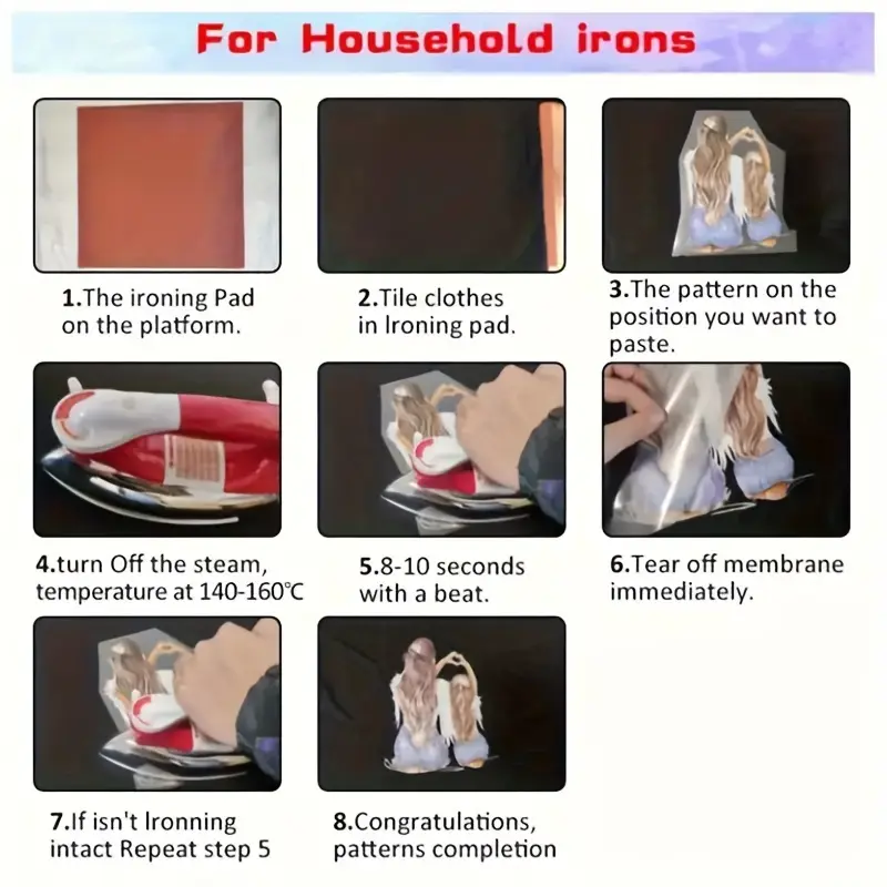 Motiv nahrubo vystřihněte a přiložte drsnější stranou na textil. Minimálně 3 minuty důkladně zažehlujte (žehličku nastavte na 180˚ C bez napařování). Nezapomeňte na okraje. A POZOR! Nejprve nechte zchladnout a teprve následně opatrně sloupněte vrchní vrstvu!